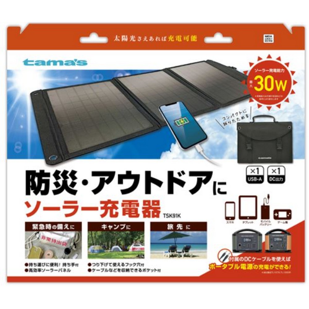 太陽光さえあれば充電可能、防災・アウトドアに便利なソーラー充電器。電気のない場所でも太陽光を電力に変換!USB-Aポートからスマートフォンなどに直接充電できる!持ち運びに便利な折り畳み式!持ち手付。つり下げて使えるフック穴付き、ケーブルなどを収納できるポケット付き。付属DCケーブルで当社製ポータブル電源の充電が可能※TL107G・TL108OR