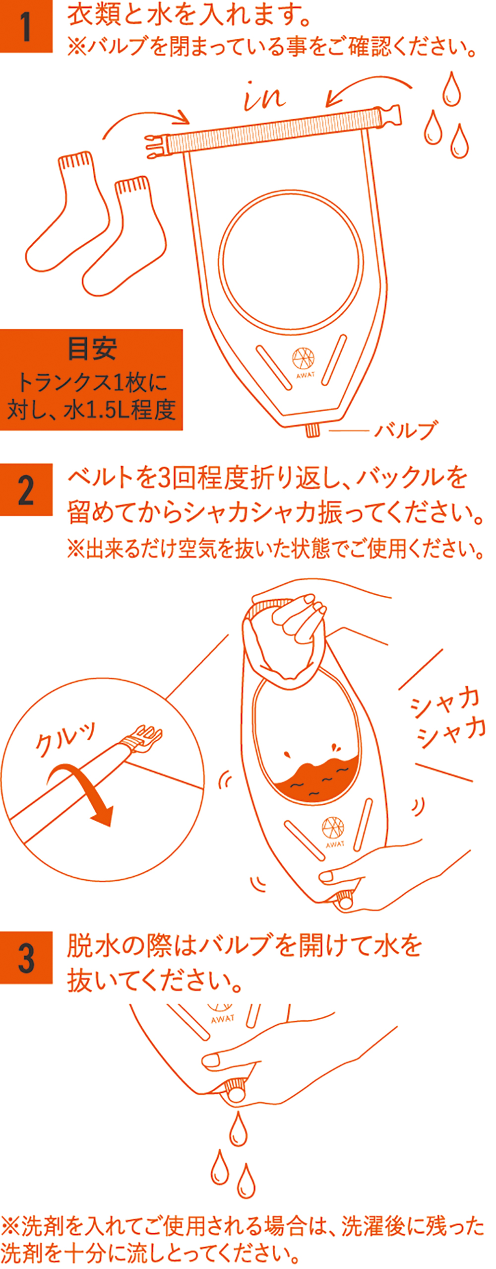 ●衣類と水を入れてシャカシャカ振るだけ!内部で強力な水流が発生し、洗濯物を洗いあげていきます。