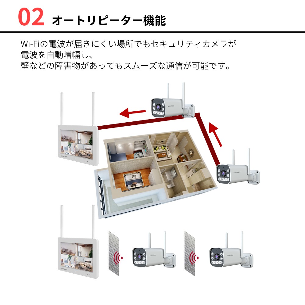 ■オートリピーター機能によりWi-Fiの電波が届きにくい場所でもセキュリティカメラが電波を自動増幅し、壁などの障害物があってもスムーズな通信が可能