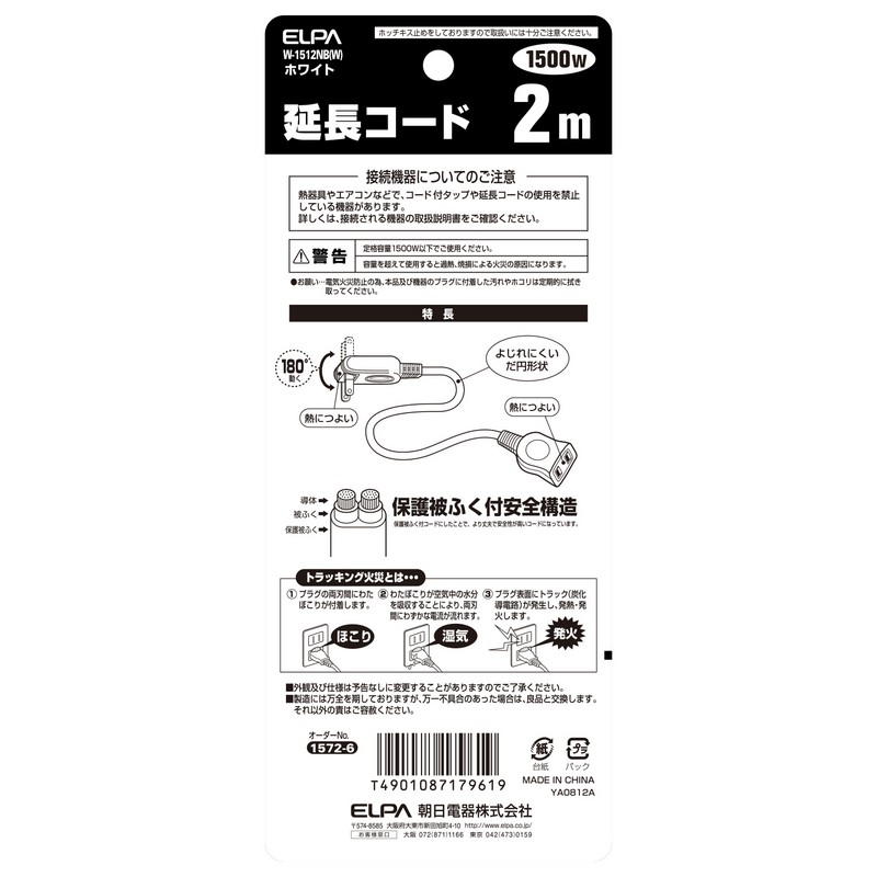 エルパ(ELPA) 延長コード コード長 2m スイングプラグ W-1512NB(W)