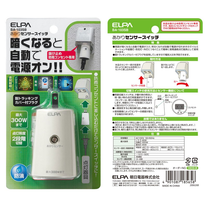 ●周囲が暗くなると自動で電源が入り、明るくなれば自動で電源が切れますので、イルミネーションや庭園灯・防犯灯・外灯につなぐことで、簡単に夜間連続点灯器具として使用できます。