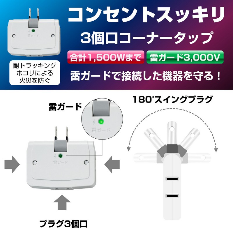 ●1つのコンセントから3方向に電源を分配することができます。