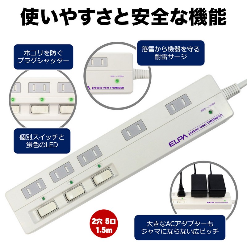 ●電源ラインサージ低減。内蔵されたサージ低減素子(バリスタ)が雷および開閉サージを低減し接続された機器を守ります。