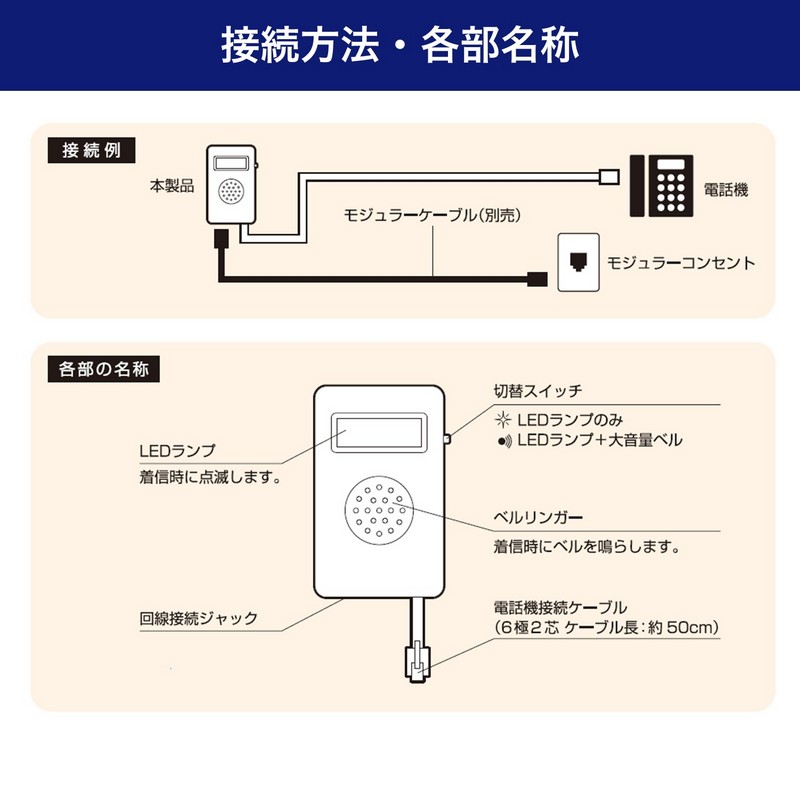 ●電話の着信を、LEDランプと大音量ベル(約90db)で知らせます