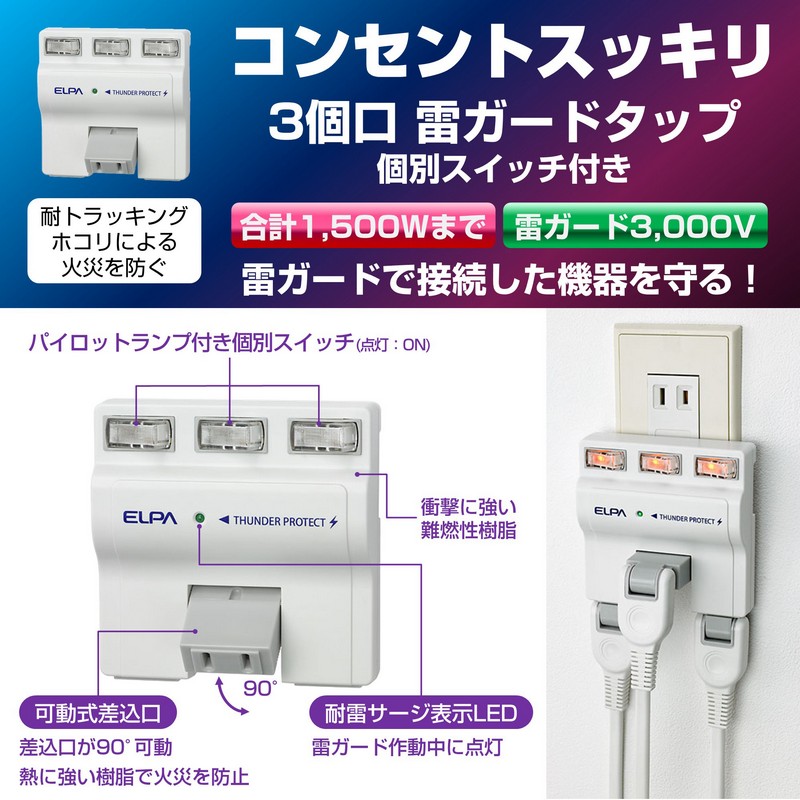 ●電源ラインサージ低減・・・内蔵されたサージ低減素子(バリスタ)が雷および開閉サージを低減し接続された機器を守ります