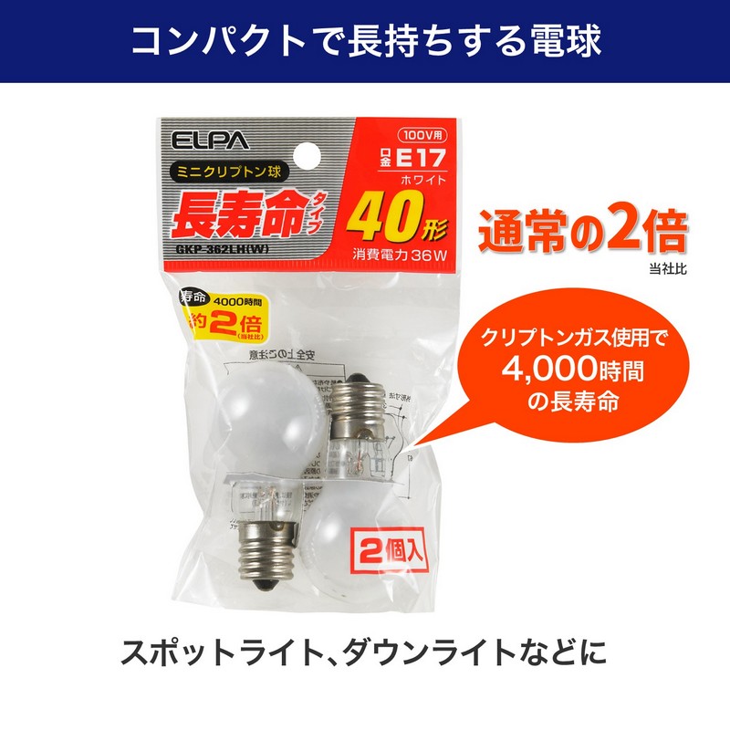 ●アルゴンガスよりも熱伝導率の低いクリプトンガスの封入で長寿命を実現した電球です。外径のコンパクト化によってスポットライト、ダウンライトなど幅広く使用できます