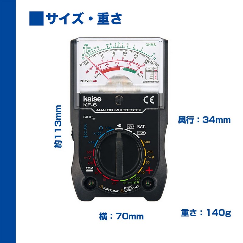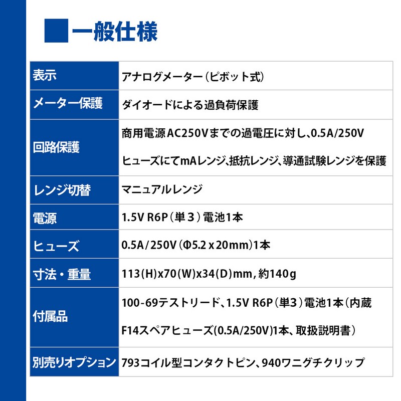■付属品:テストリード1組、単三形乾電池1本(テスト用 内蔵)、スペアヒューズ0.5A 250V 1本、取扱説明書