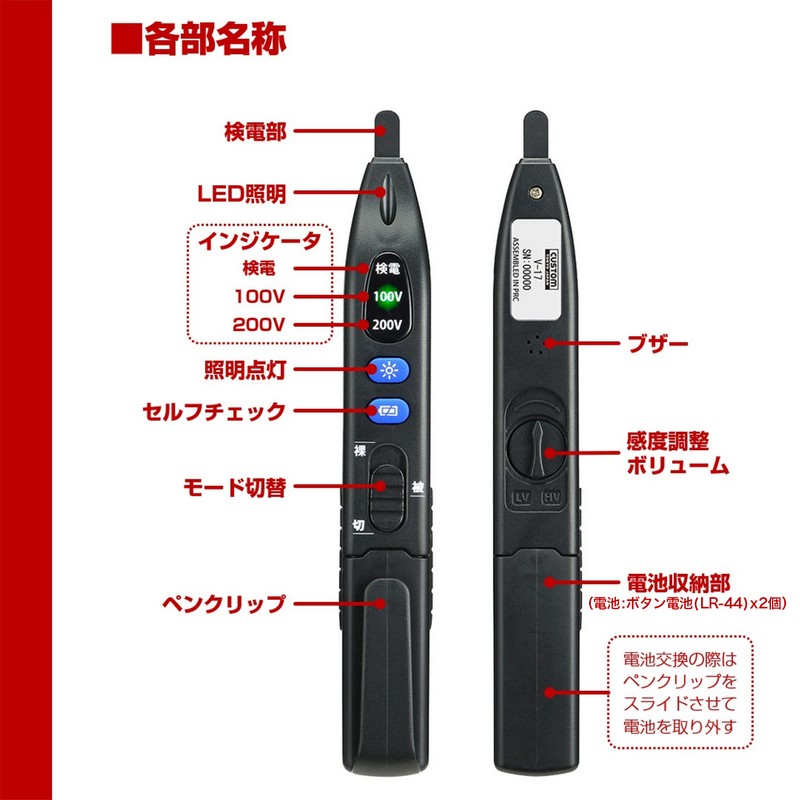 100V LED:接触モード時 AC7V~約125Vの電圧を検出した際点灯