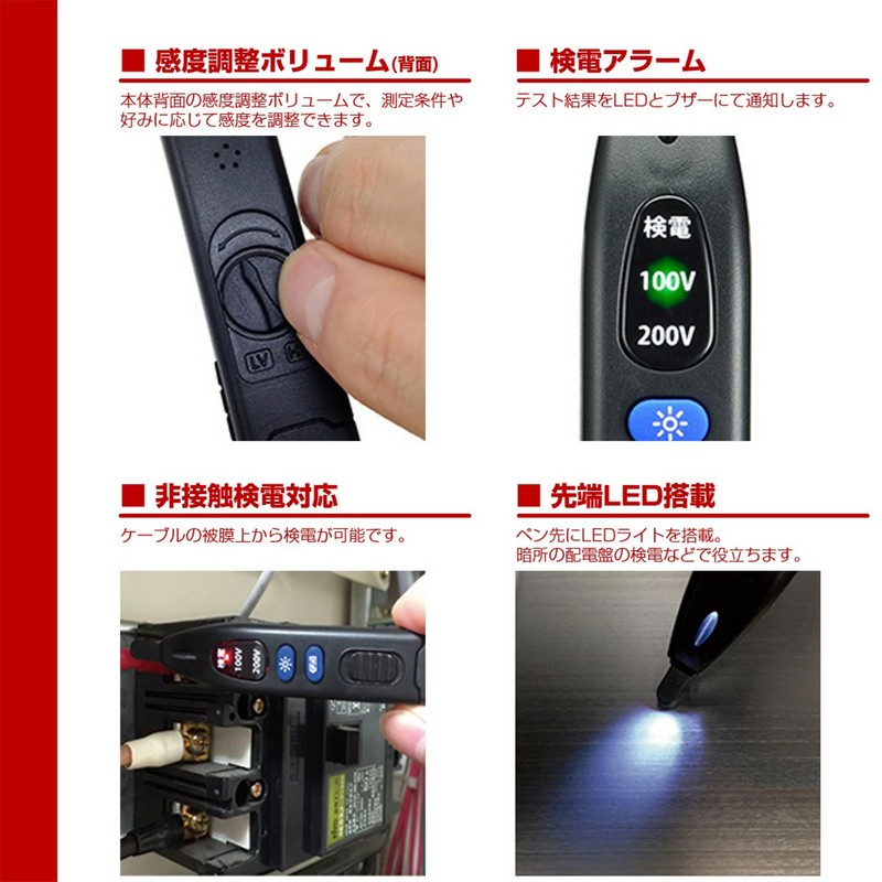 ●非接触式(AC)と接触式(AC)の通電状況を簡単操作でチェックするペンタイプの検電計です。
