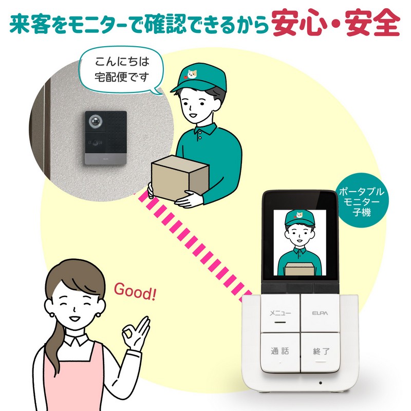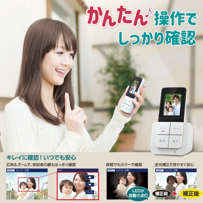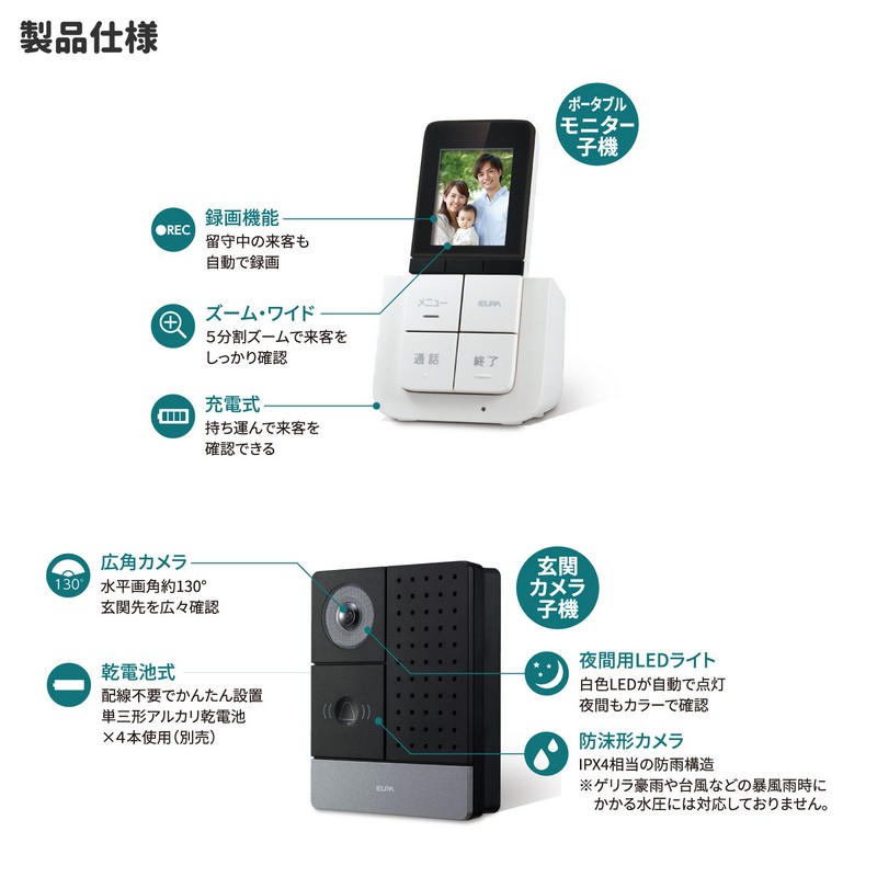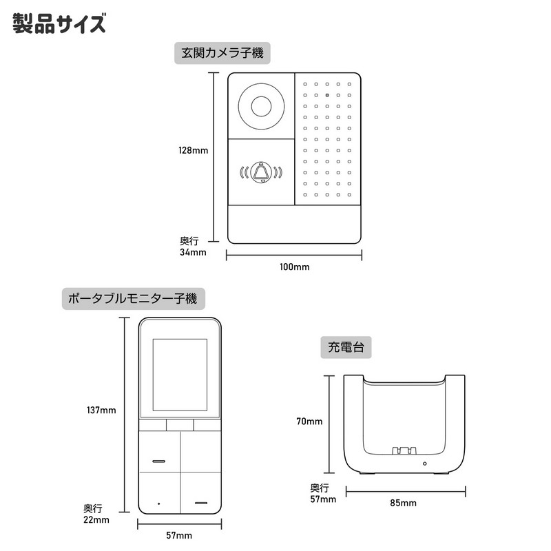 カメラ用フロントパネルX1枚、電池パック、壁掛用木ネジX4本、壁掛用アンカーX4本、充電台親機用ACアダプター(コード長約1.8m)、取扱説明書1冊、設置説明書1部