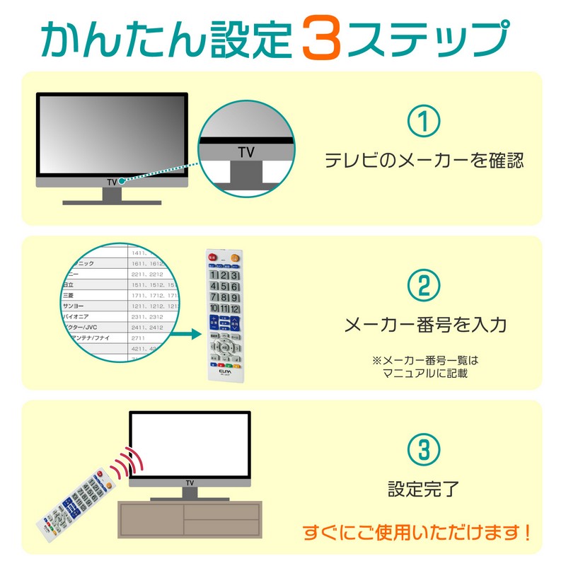 ●対応メーカー:シャープ、東芝、パナソニック、ソニー、日立、三菱、サンヨー、パイオニア、ビクター/JVC、DXアンテナ/フナイ、LG、オリオン(ベルソン)、ユニデン、エプソン、バイ・デザイン、ナナオ、アズマ、DYNEX、MrMax、TMY、neXXion、CANDELA、Hisense