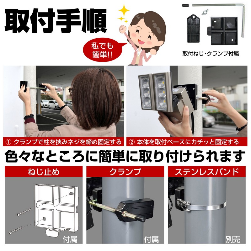 ■付属品:取付ネジ2本、コンクリート用スリーブ2本、マスキングカバー1個、クランプ1セット