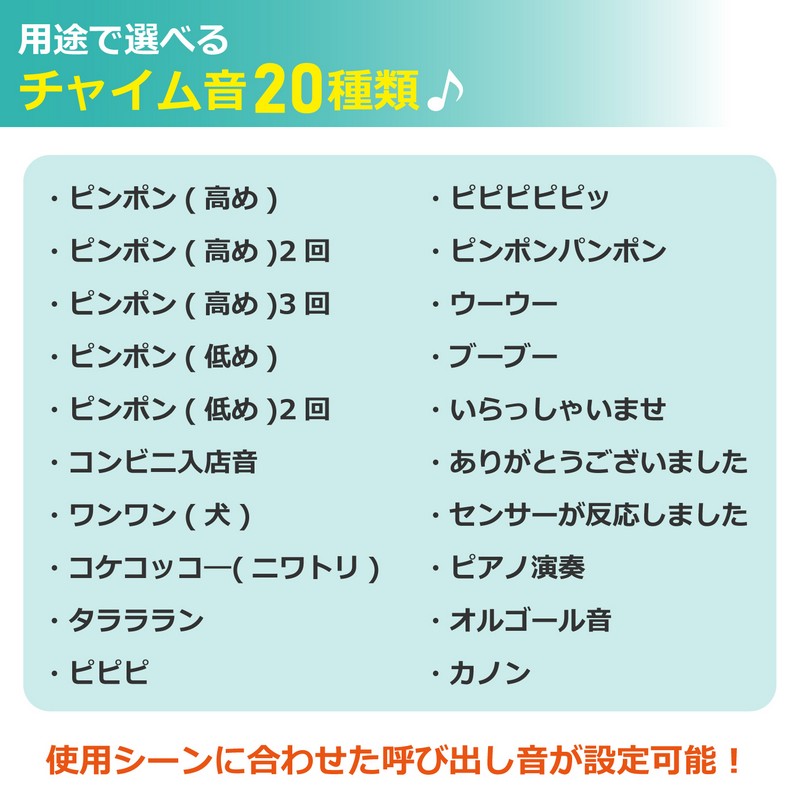 ●お好みで設定できる20種類の報知音。送信器ごとに異なる音を設定できるので、音による送信器の判別が可能です。