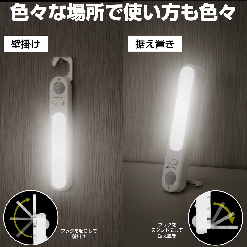 ●暗い時にセンサーが人を検知すると自動で点灯し、約13秒後に自動で消灯します。
