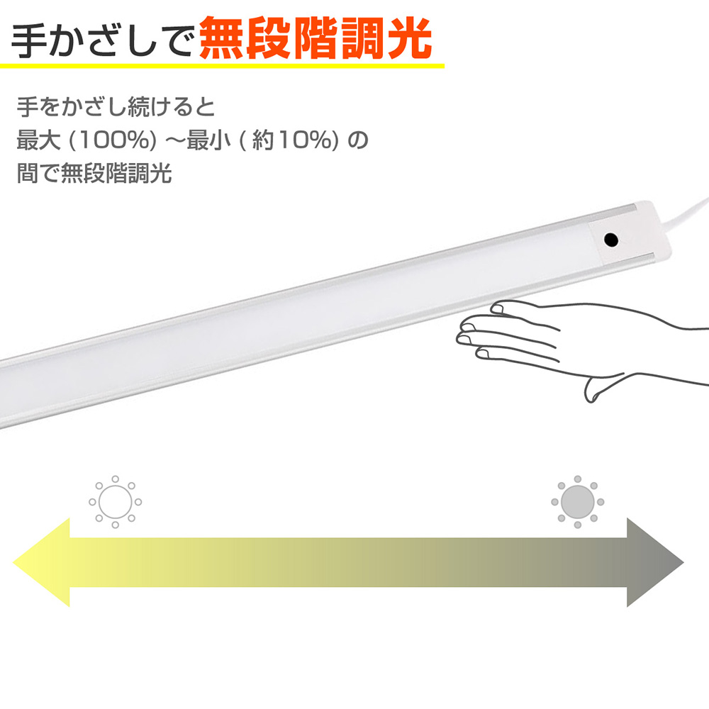 ●非接触スイッチに手をサッとかざすだけで電源をON/OFF、手をかざし続けると最大(100%)~最小(約10%)の間で無段階調光できる。