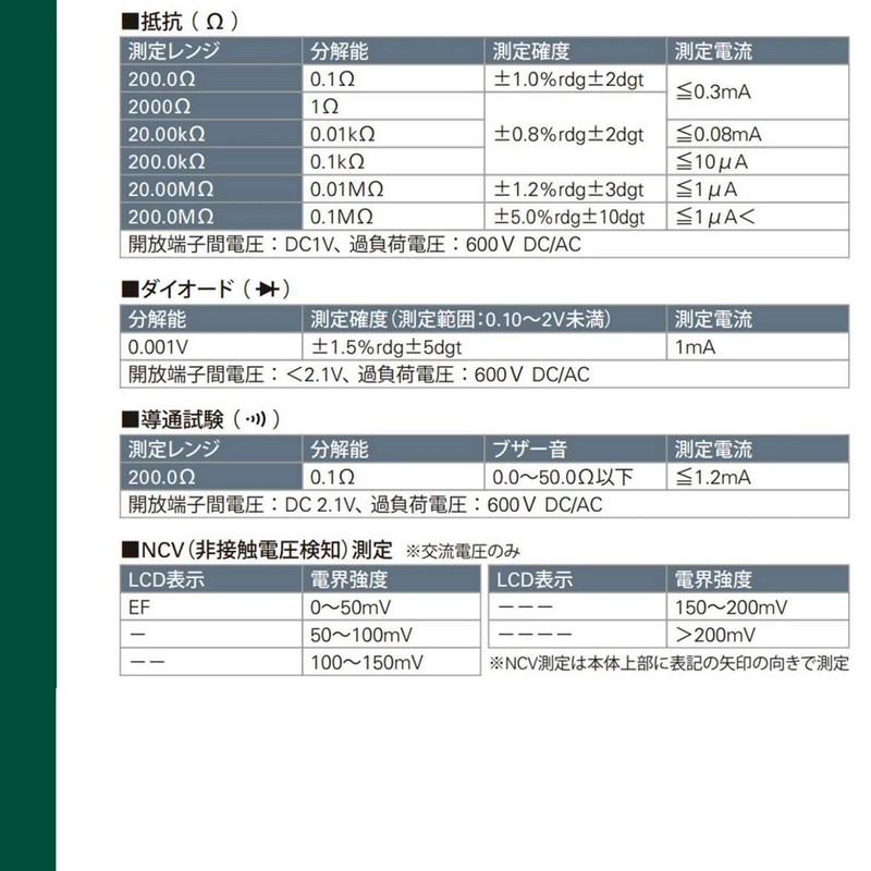 ■付属品:単四形乾電池 2本(テスト用 内蔵)、テストリード 1組、ホルスター、取扱説明書、スペアヒューズ(0.2A/250V(Φ5×20mm)、10A/250V(Φ5×20mm))各1本