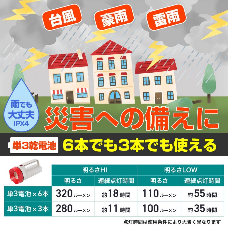 ■連続点灯時間(約):乾電池×6本使用時 HI 18時間/LOW 55時間、乾電池×3本使用時 HI 11時間/LOW 35時間