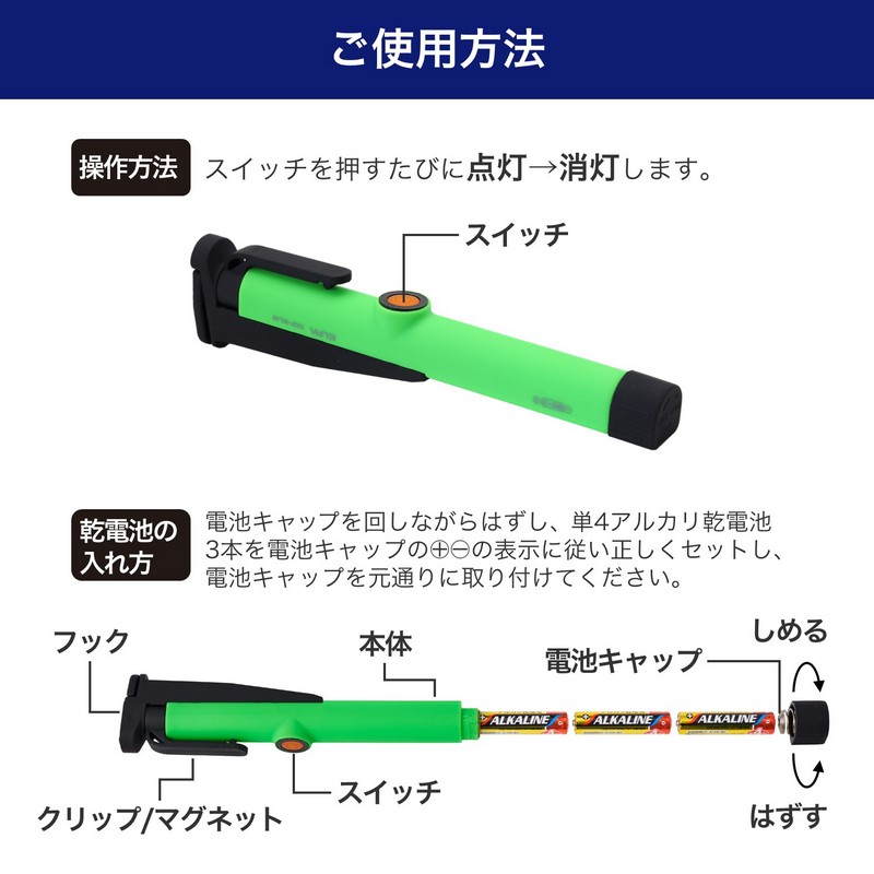 ■使用電池:単四形アルカリ乾電池×3本(別売)