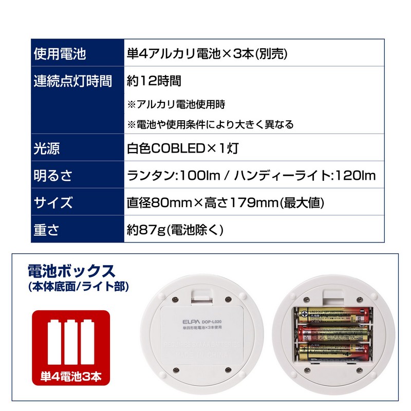 ※電池の性能、使用条件により連続点灯時間は短くなる場合があります。