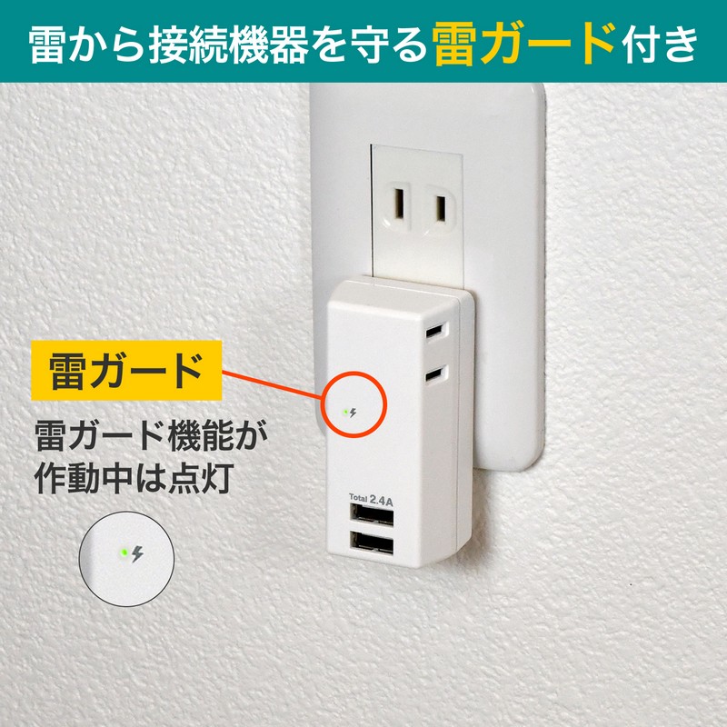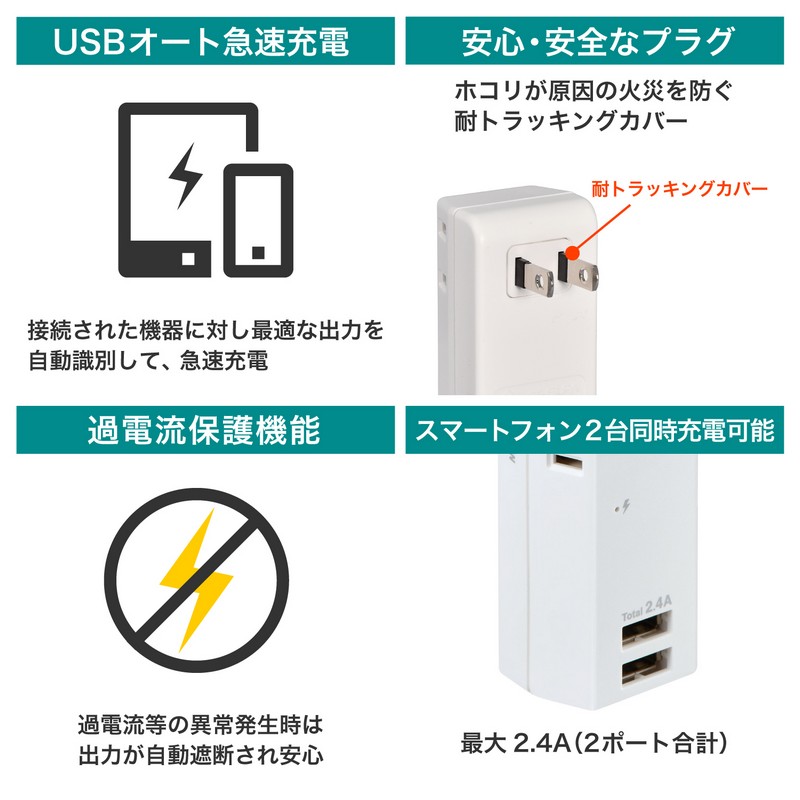 ●接続された機器(iPhone、iPad、Android等)に対し、最適な出力を自動識別し、急速充電する自動識別機能