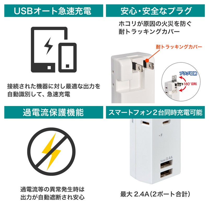 ●接続された機器(iPhone、iPad、Android等)に対し、最適な出力を自動識別し、急速充電する自動識別機能