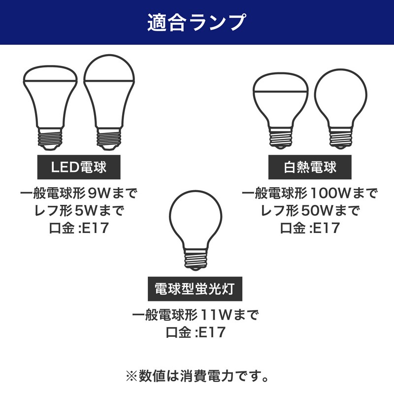 白熱電球:一般電球形100Wまで / レフランプ形50Wまで