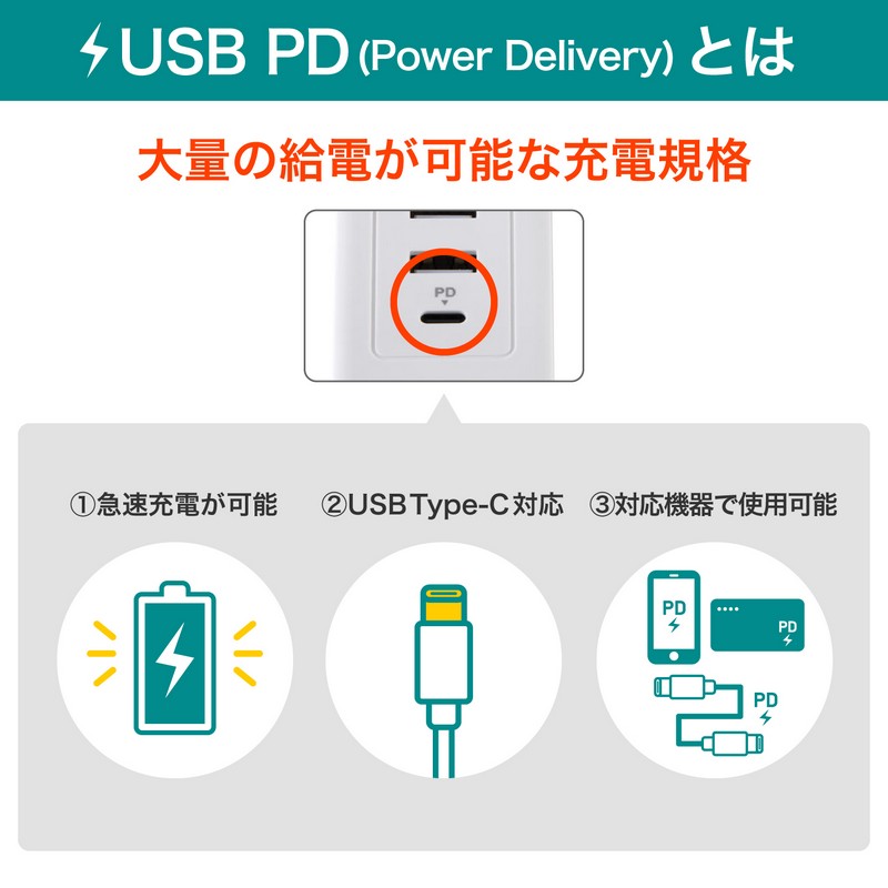 ●PD(パワーデリバリー)対応で、スマートフォン、タブレット等を超速充電できます。最大20Wまでの給電が可能。