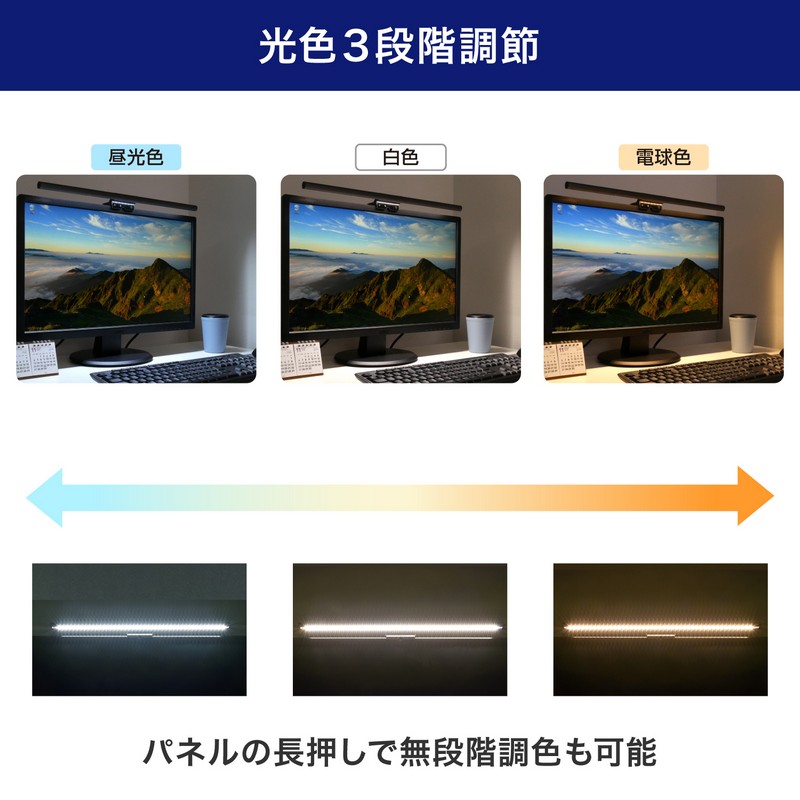 ●光色3段階 白色-昼光色-電球色 長押しで無段階調色可能