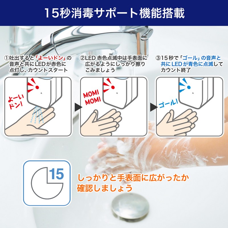 ●15秒間音声と光でお知らせする消毒サポーター機能