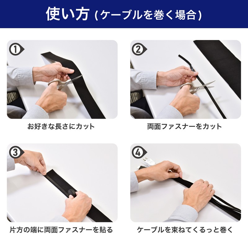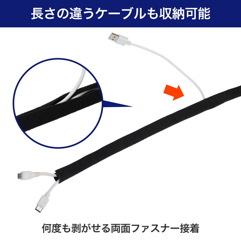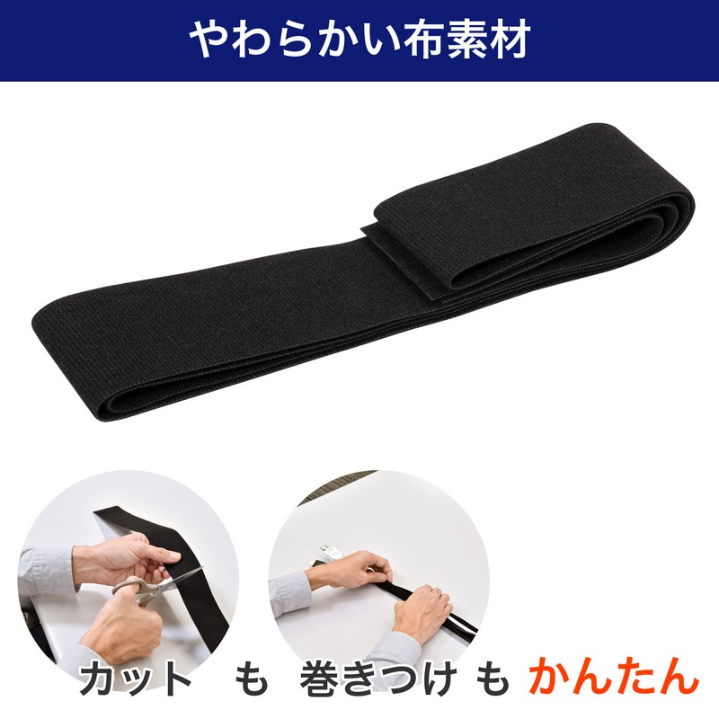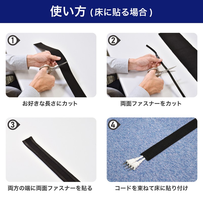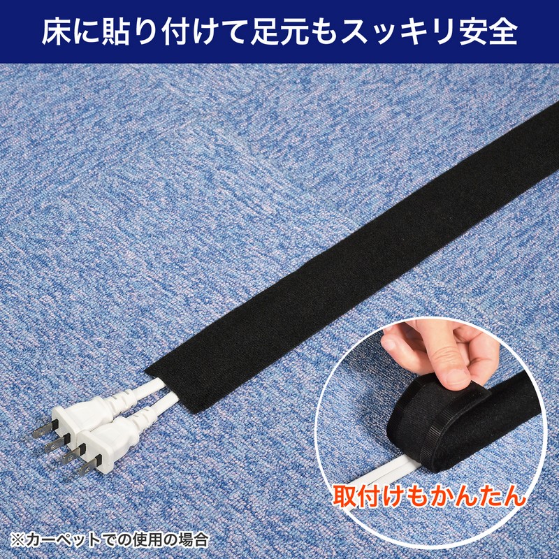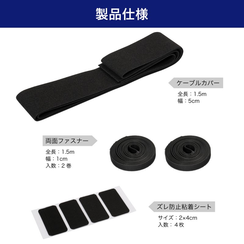■セット内容:ケーブルカバー(両面起毛生地)(幅5cm×1.5m) / 材質:ポリエステル、両面ファスナー(幅1cm×1.5m)×2巻 ※オス面のみ / 材質:ポリプロピレン、ズレ防止粘着シート(2×4cm)×4枚 / 材質:ポリプロピレン ※粘着力により、取り外す際に塗料面などが剥がれる可能性があります