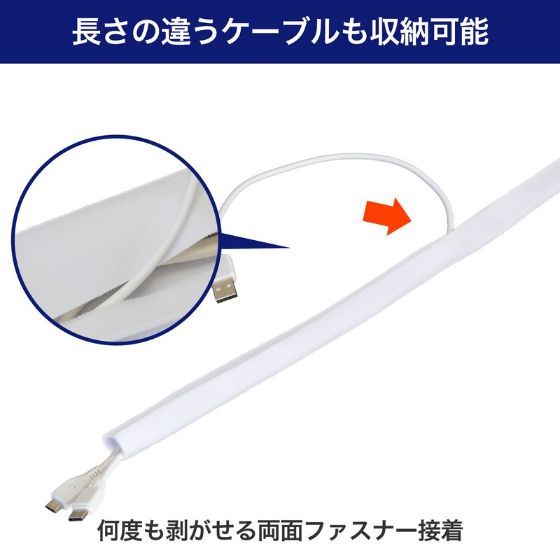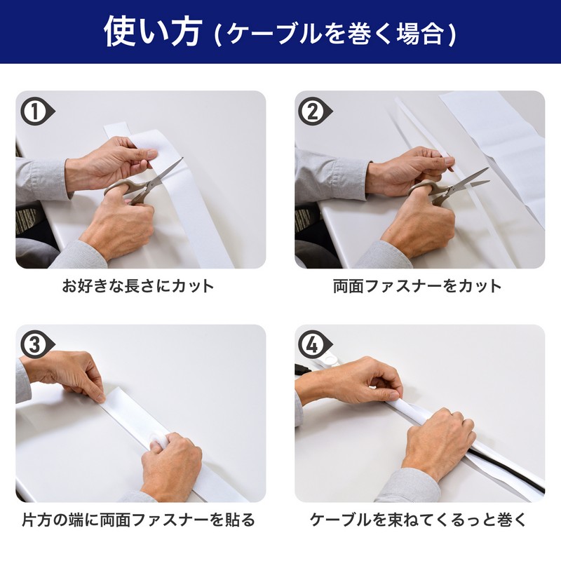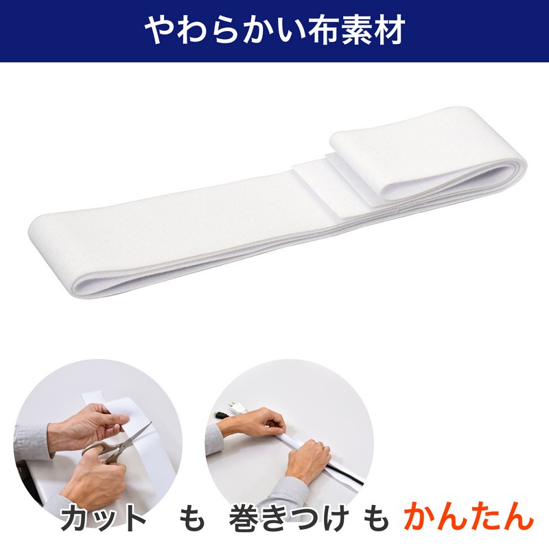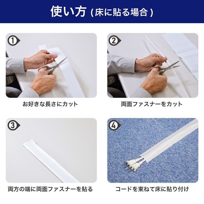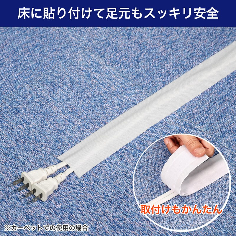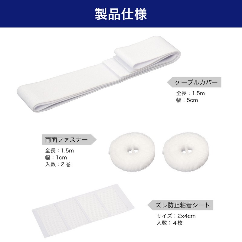 ■セット内容:ケーブルカバー(両面起毛生地)(幅5cm×1.5m) / 材質:ポリエステル、両面ファスナー(幅1cm×1.5m)×2巻 ※オス面のみ / 材質:ポリプロピレン、ズレ防止粘着シート(2×4cm)×4枚 / 材質:ポリプロピレン ※粘着力により、取り外す際に塗料面などが剥がれる可能性があります