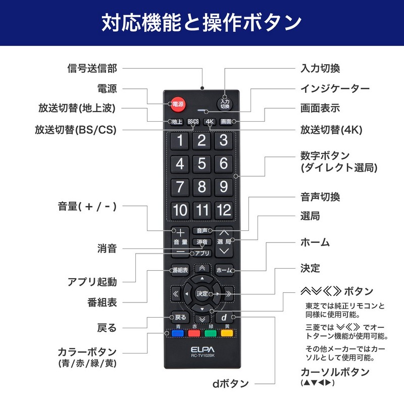 ●シンプル機能で使いやすい汎用テレビリモコン