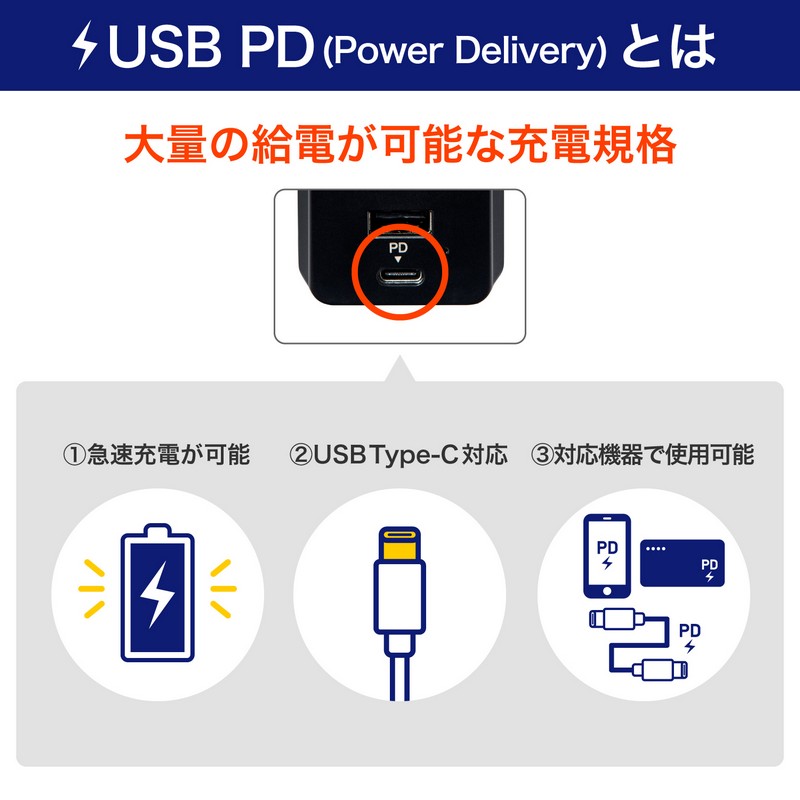●PD(パワーデリバリー)対応で、PD対応スマートフォン、タブレット等を超速充電できます。最大20Wまでの給電が可能。