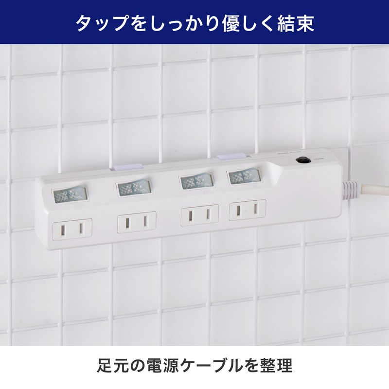 ●ワイヤーネットなどに取り付けることで、足元の邪魔な電源ケーブルを整理できます。