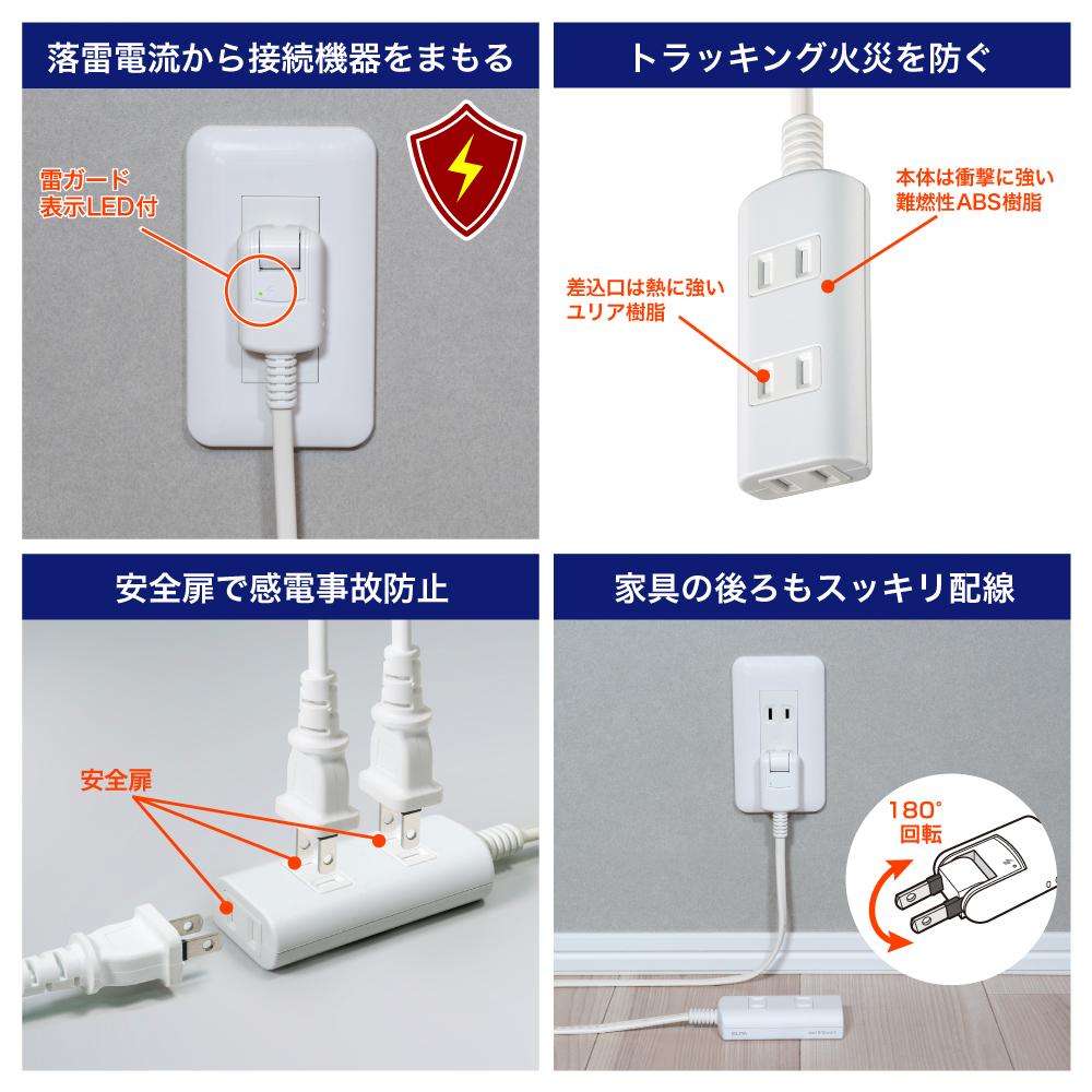 ●本体は衝撃に強い難燃性ABS樹脂、差込口は熱に強いユリア樹脂採用。