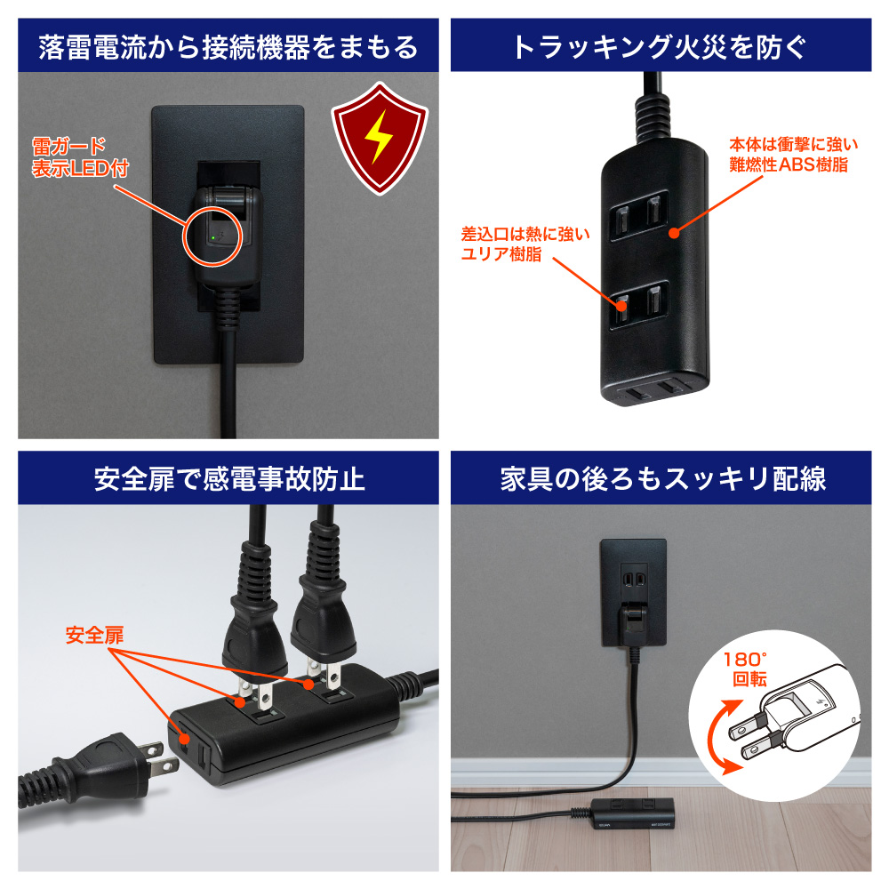 ●本体は衝撃に強い難燃性ABS樹脂、差込口は熱に強いユリア樹脂採用。