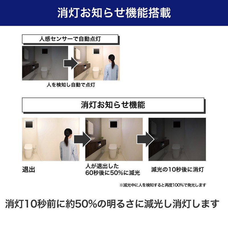 ●消灯10秒前に約50%の明るさに減光する消灯お知らせ機能搭載