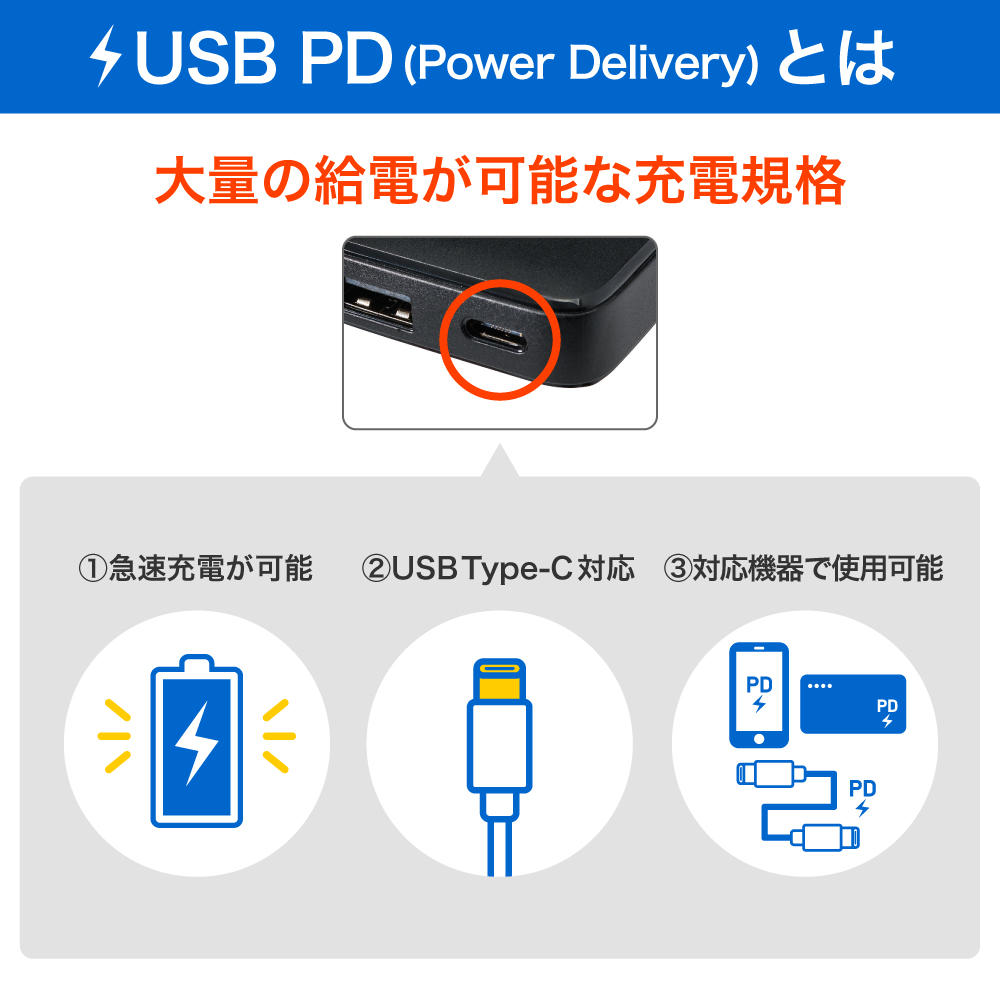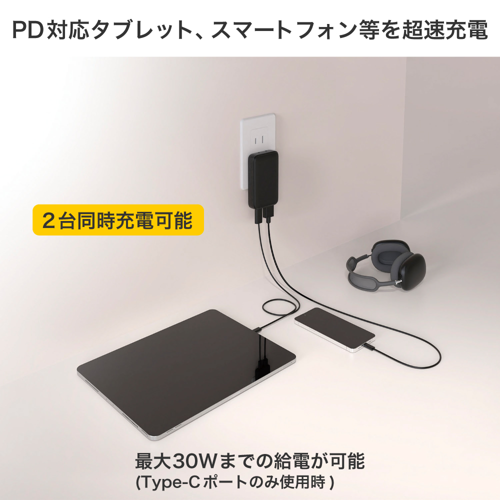 ●PD対応タブレット、スマートフォン等を超速充電できます(USBポートのうちType-Cポートのみ使用時)