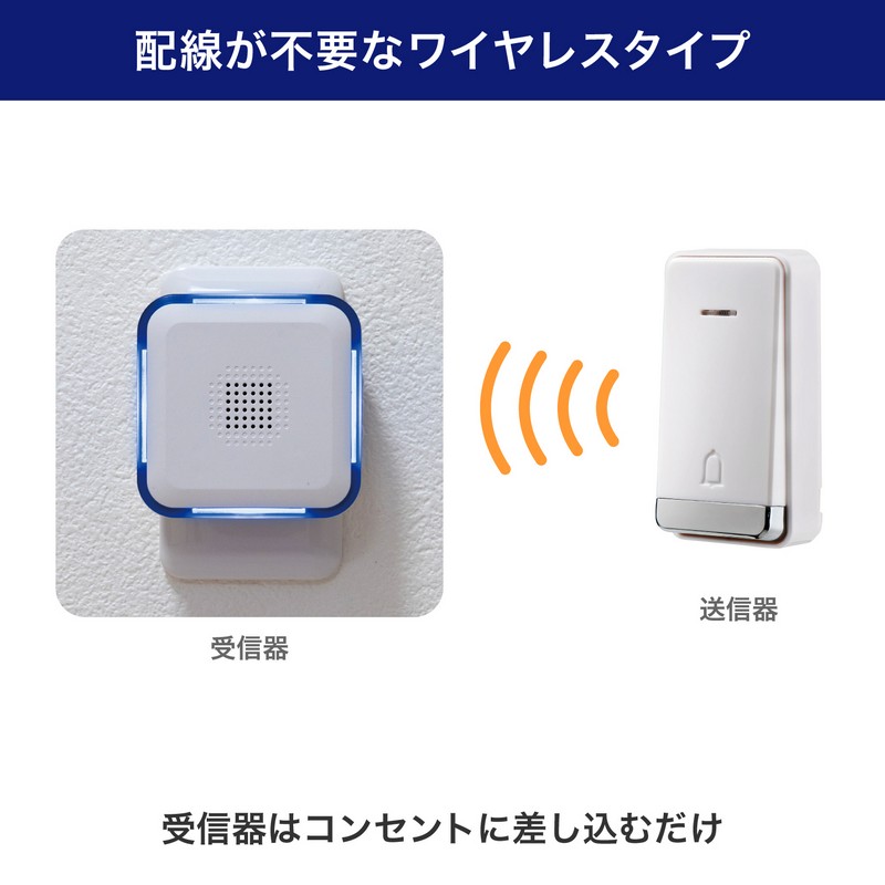 受信器はコンセントに差し込むだけ、送信器は押す力で発電するので電池不要です。