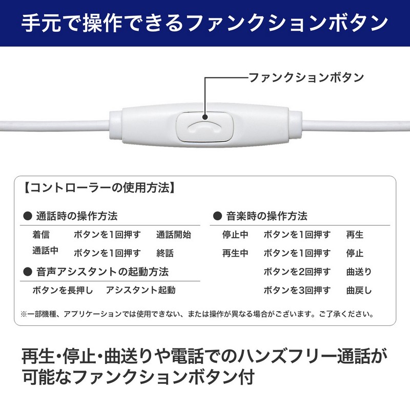 ●再生、停止、曲送りや電話でのハンズフリー通話が可能なファンクションボタン付