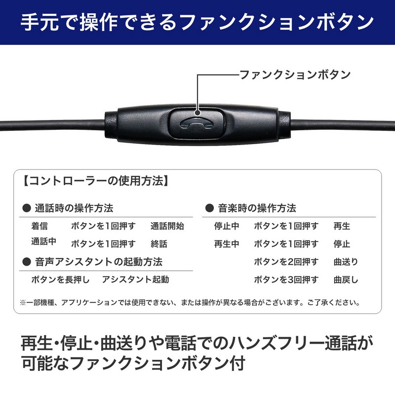 ●再生、停止、曲送りや電話でのハンズフリー通話が可能なファンクションボタン付