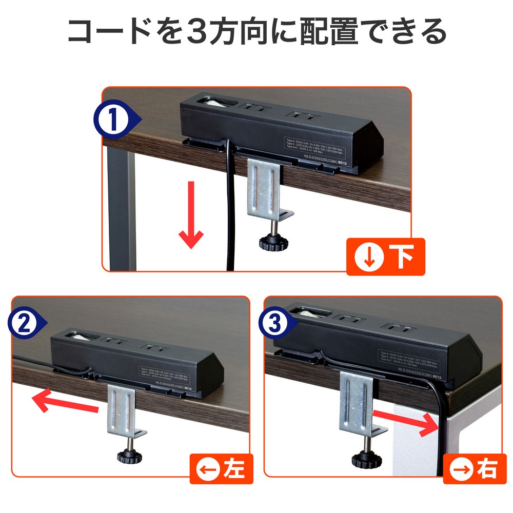 ●コードの出す向きを3方向に変えられて、机を壁にピッタリ設置できる