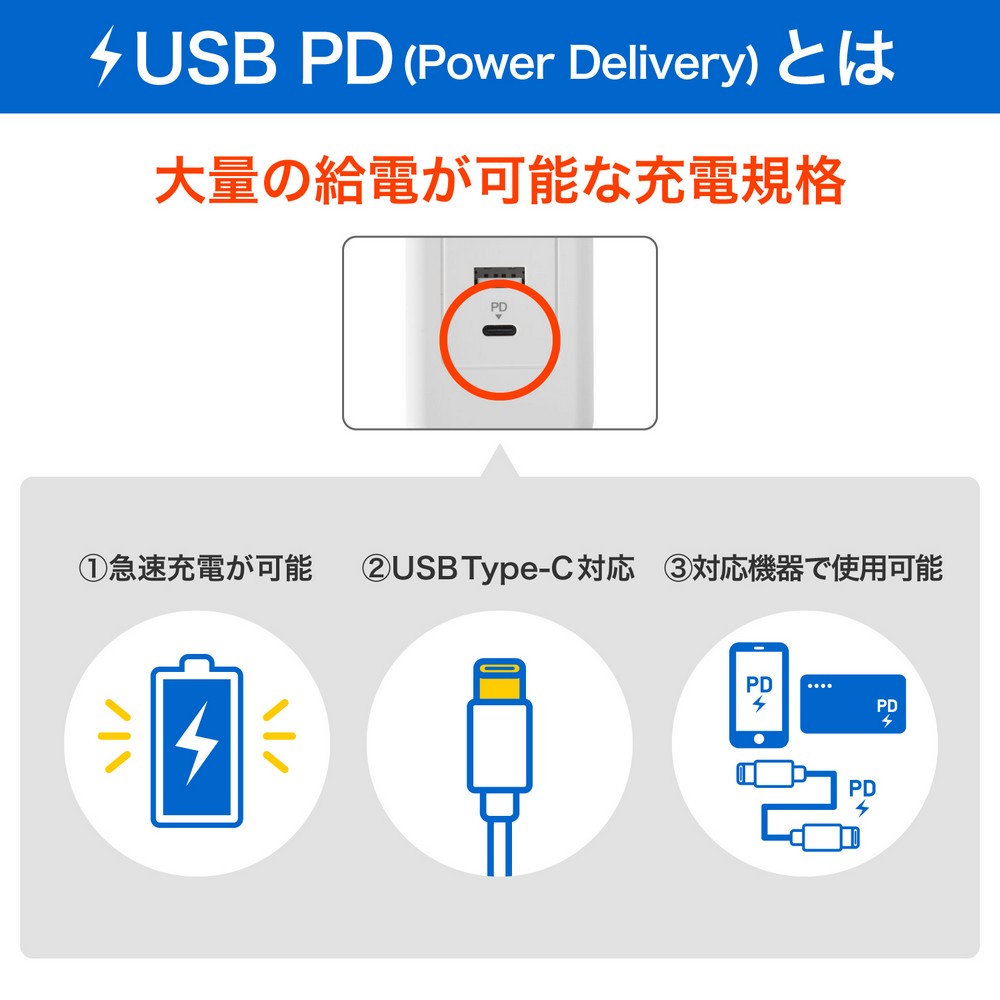 ●PD(パワーデリバリー)対応で、スマートフォン、タブレット等を超速充電できます。最大20Wまでの給電が可能。