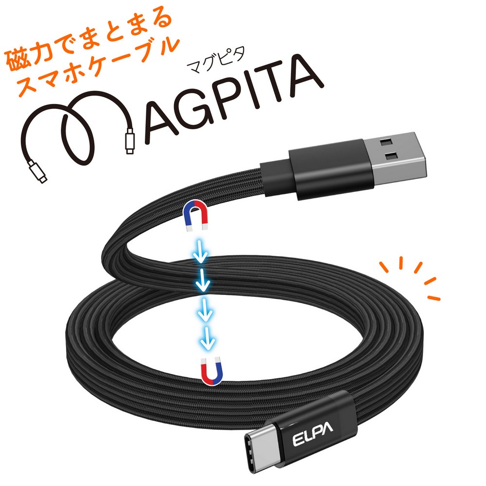 エルパ(ELPA) マグピタ マグネットUSBケーブル 平形 PD27W TypeA → TypeC 1.0m ブラック MCA-FAC1027(BK)