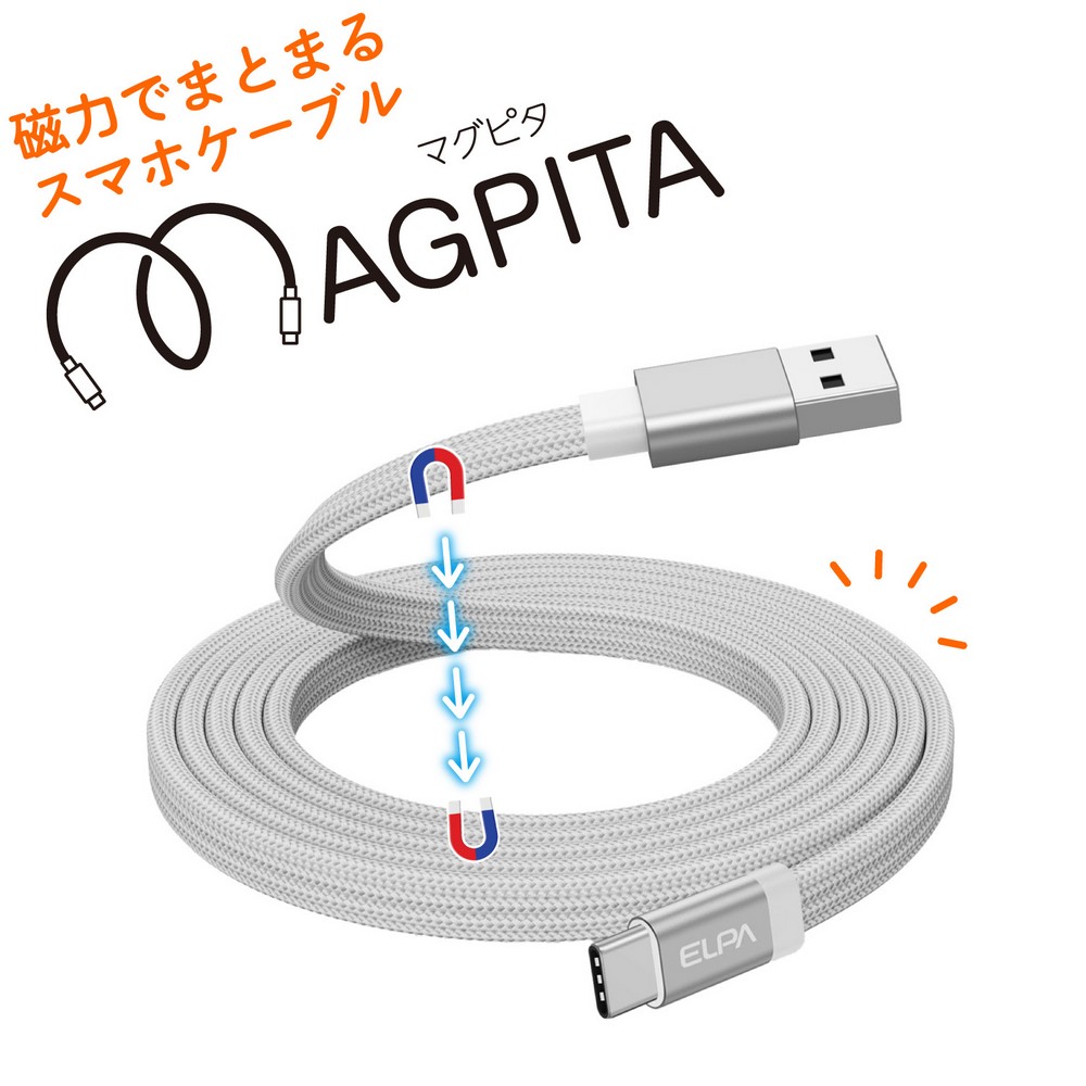 エルパ(ELPA) マグピタ マグネットUSBケーブル 平形 PD27W TypeA → TypeC 1.5m ホワイト MCA-FAC1527(WH)