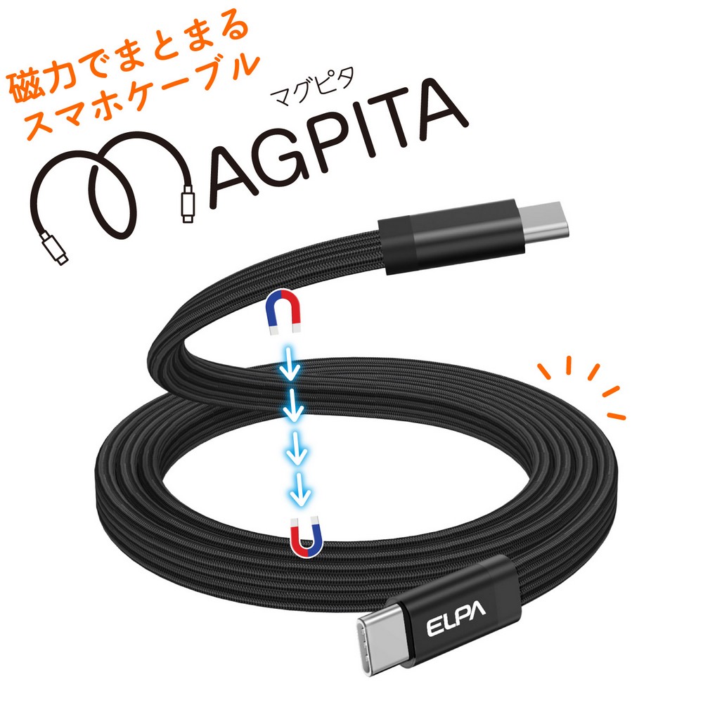 エルパ(ELPA) マグピタ マグネットUSBケーブル 平形 PD60W TypeC → TypeC 1.0m ブラック MCA-FCC1060(BK)
