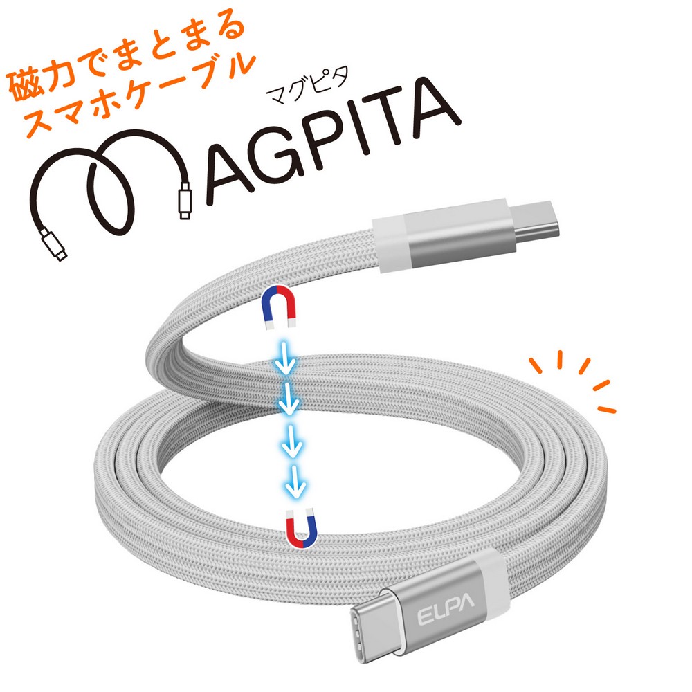 エルパ(ELPA) マグピタ マグネットUSBケーブル 平形 PD60W TypeC → TypeC 1.0m ホワイト MCA-FCC1060(WH)
