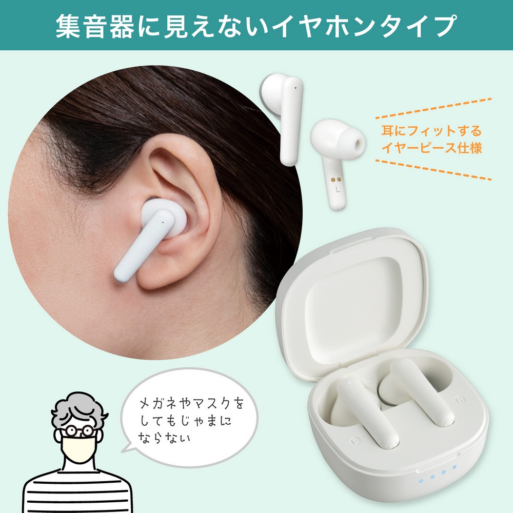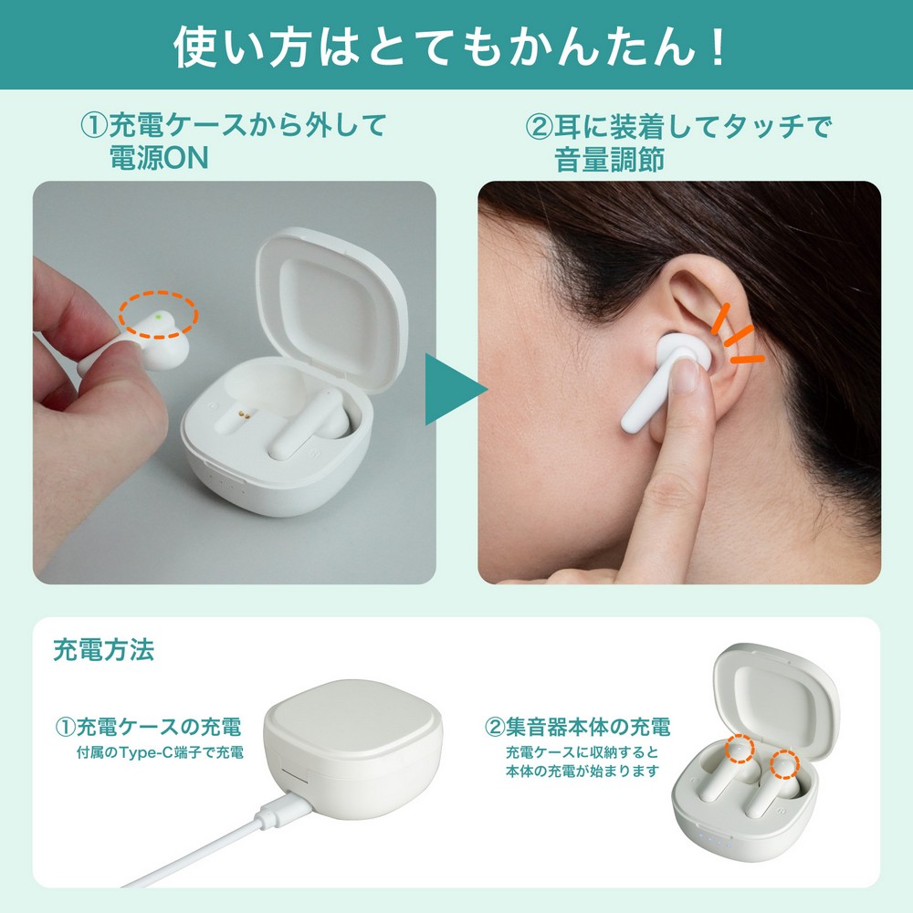 ■セット内容:集音器本体、充電ケース、USBケーブル、ACアダプター、イヤーピースSML各2 ※ご購入時はMサイズが集音器本体に取り付けられています、クリーニングブラシ、収納ポーチ、取扱説明書、簡単マニュアル