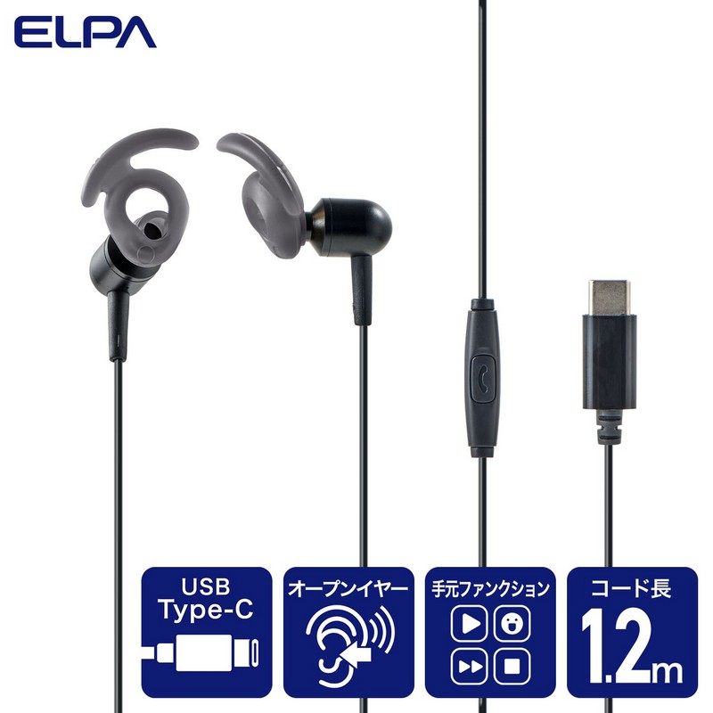 エルパ(ELPA) まわりの音も聞こえるイヤホン スマホ用 USB Type-C 1.2m ブラック OEP-C12(BK)