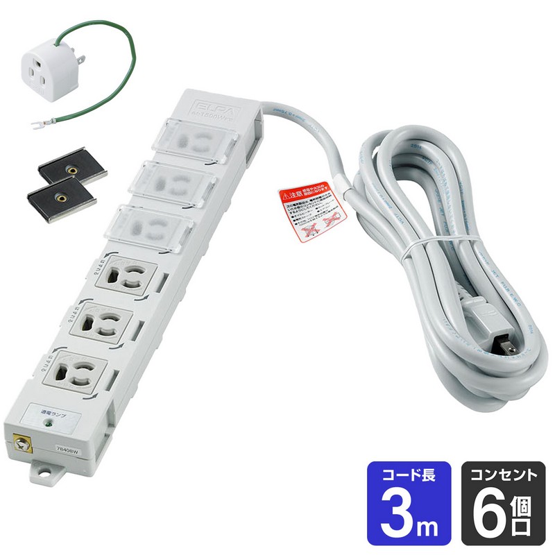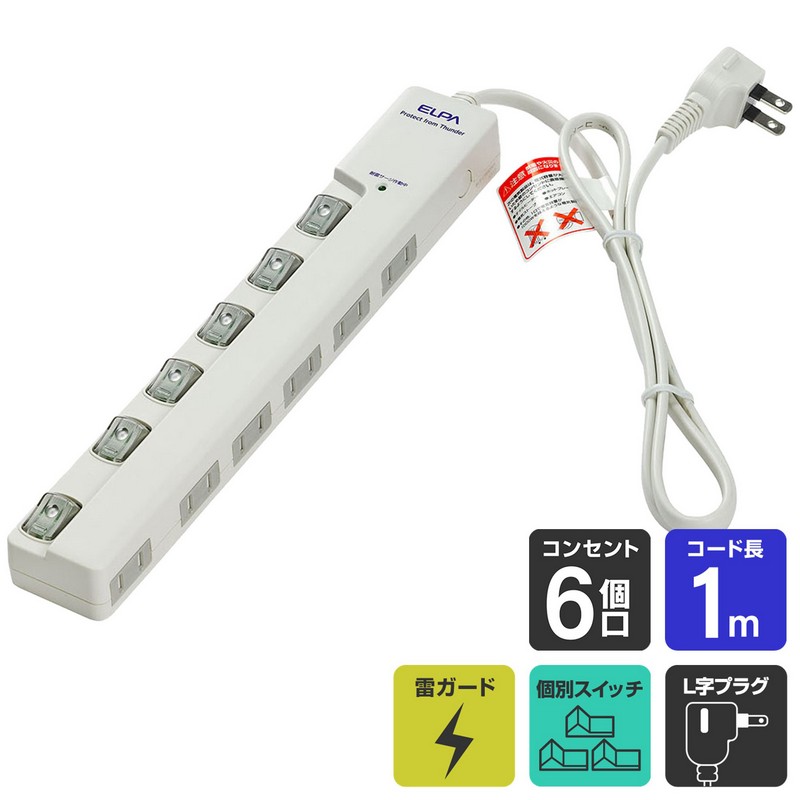 【セール】エルパ(ELPA) 電源タップ 個別スイッチ 上差し AC6個口 コード長 2m 雷ガード 安全ブレーカー WLS-LU620SB(W)